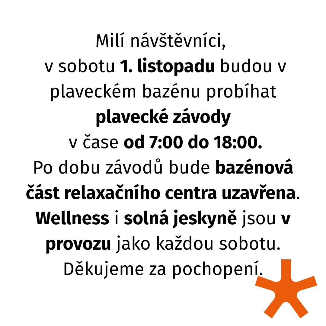 Bazén, wellness i solnou jeskyni je třeba opustit nejpozději do 20.45, aby jste měli dostatek času do 21.00 na umytí a oblečení. Relaxační centrum se zavírá v 21.00.