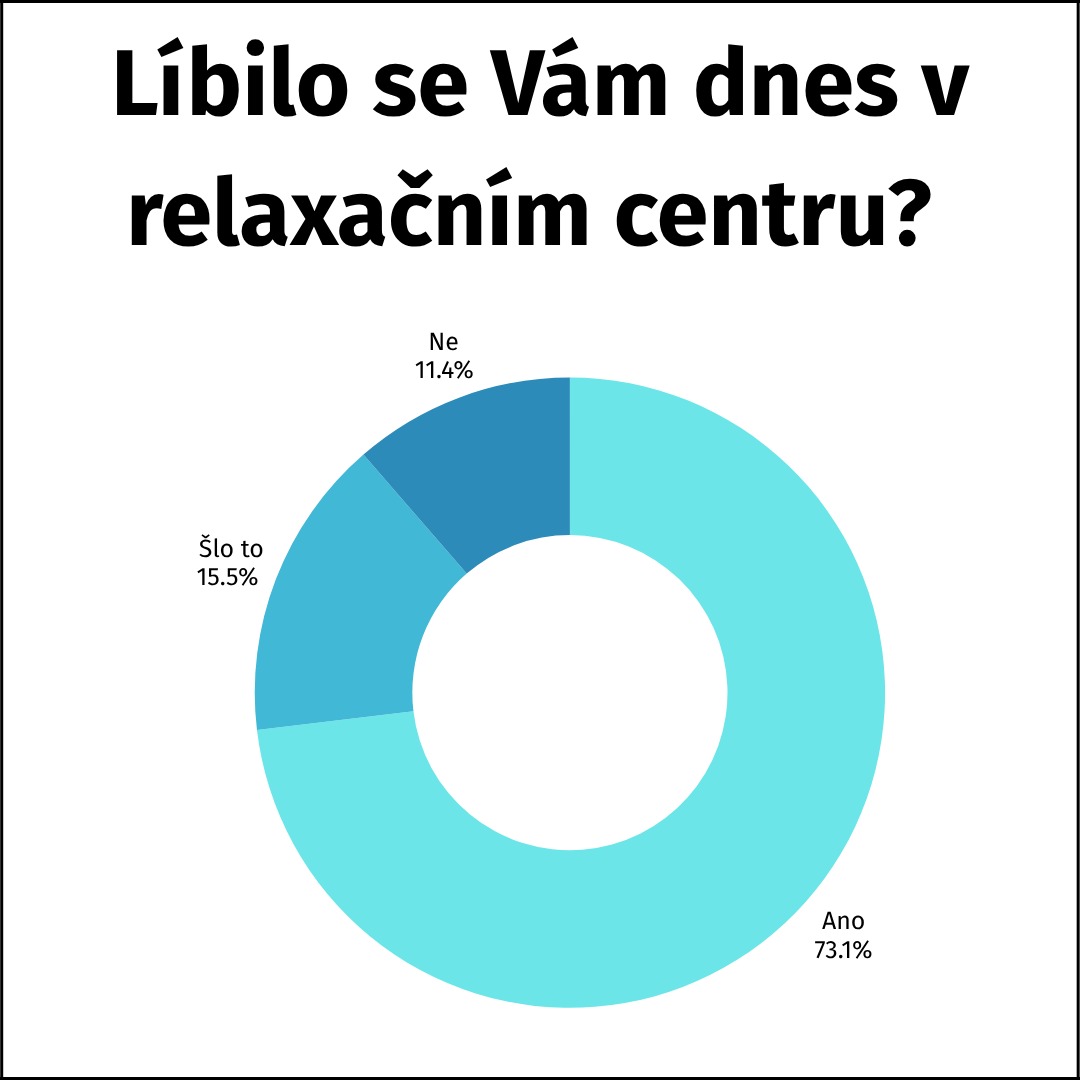 Těší nás také, že více než 73 % návštěvníků odchází z našeho centra spokojených. Dalších 15,5 % označilo pobyt jako „šlo to“ a 11,4 % spokojených nebylo. Velmi nás těší, že většina návštěvníků byla s pobytem v relaxačním centru spokojena, a i nadále budeme usilovat o zvyšování kvality našich služeb.