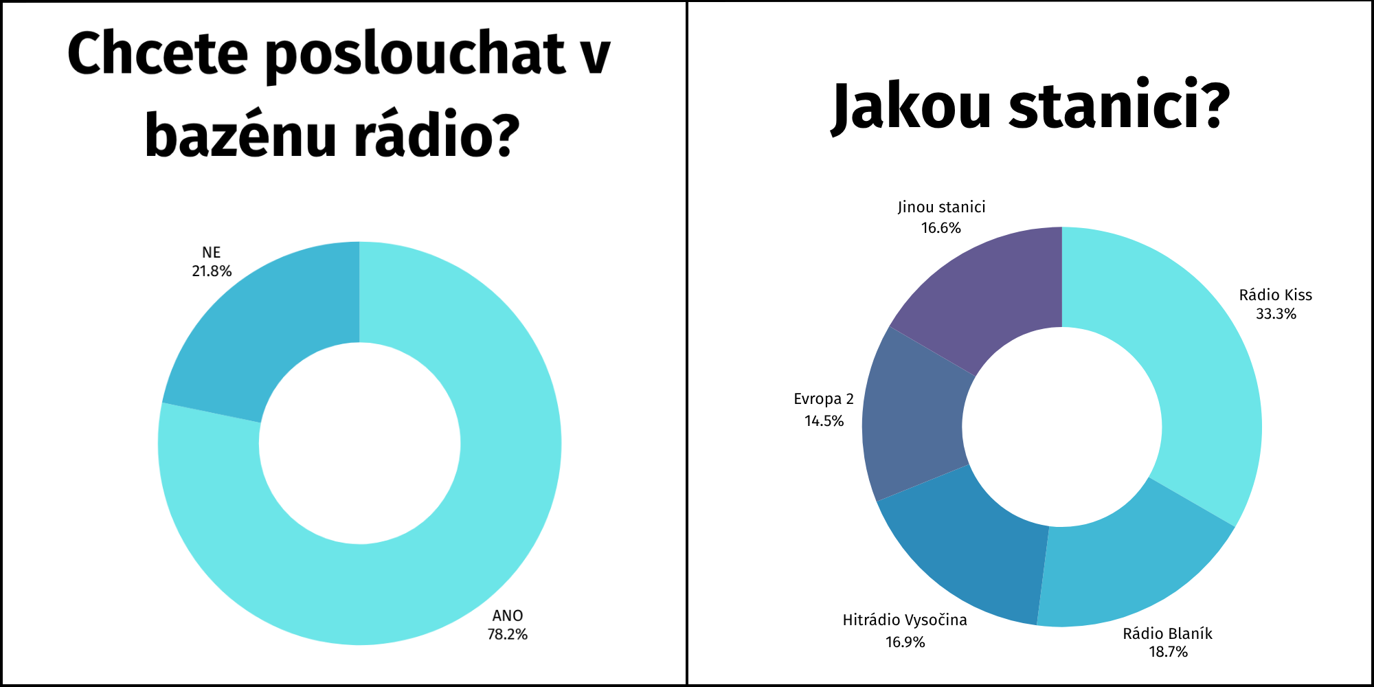Z předposledního dotazníku vyplynulo, že 78,2 % návštěvníků by preferovalo, aby v relaxačním centru hrálo nadále rádio. Nejčastěji byste preferovali Rádio Kiss, dále Rádio Blaník, Hitrádio Vysočina nebo Evropu 2. Rádio bude v bazénu hrát i nadále a do konce roku po vyřešení technických problémů přidáme další stanice podle Vašich preferencí.